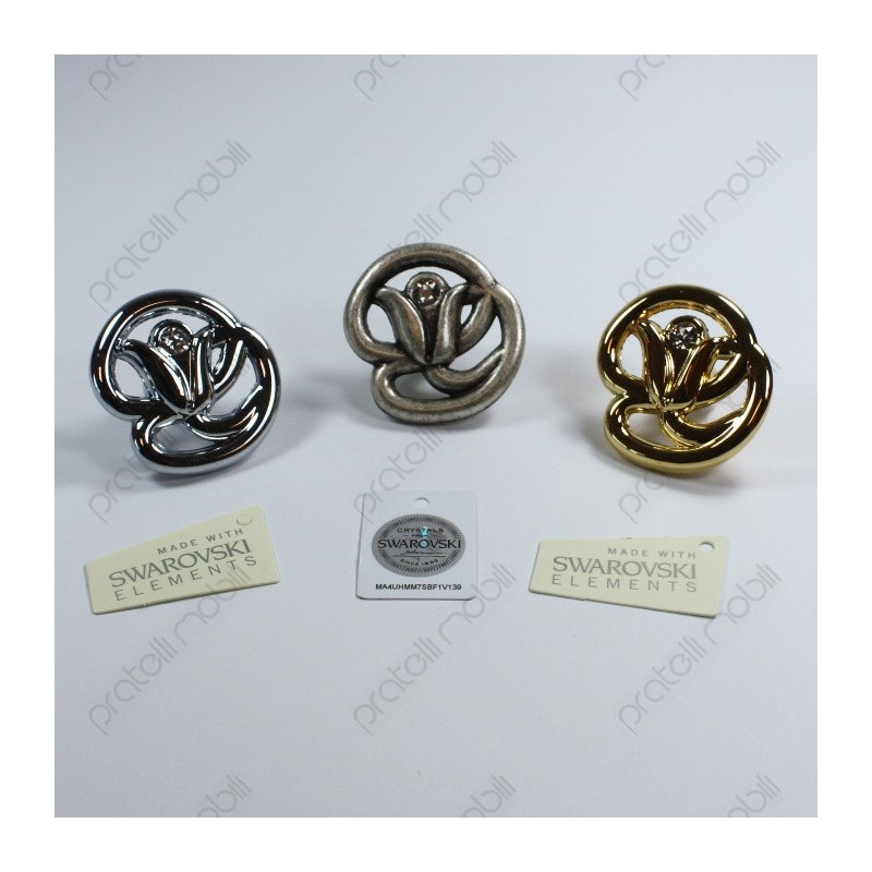 Maniglia per mobili dallo stile sinuoso ed elegante, impreziosita da piccoli strass originali Swarovski posto ai lati e al centro. Il disegno di questo accessorio è composto da tre tulipani intrecciati.